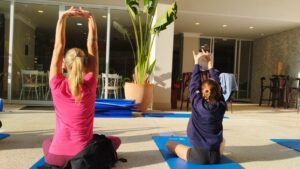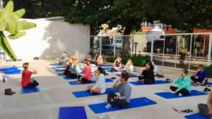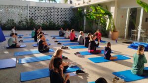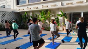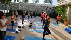 Convidados a reequilibrar o corpo e a mente, a pratica trabalha a postura, respiração, meditação e consciência para o corpo.