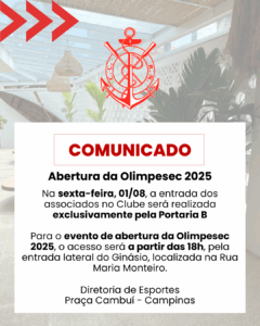 Para o evento de abertura da Olimpesec 2025, o acesso será a partir das 18h, pela entrada lateral do Ginásio, localizada na Rua Maria Monteiro.