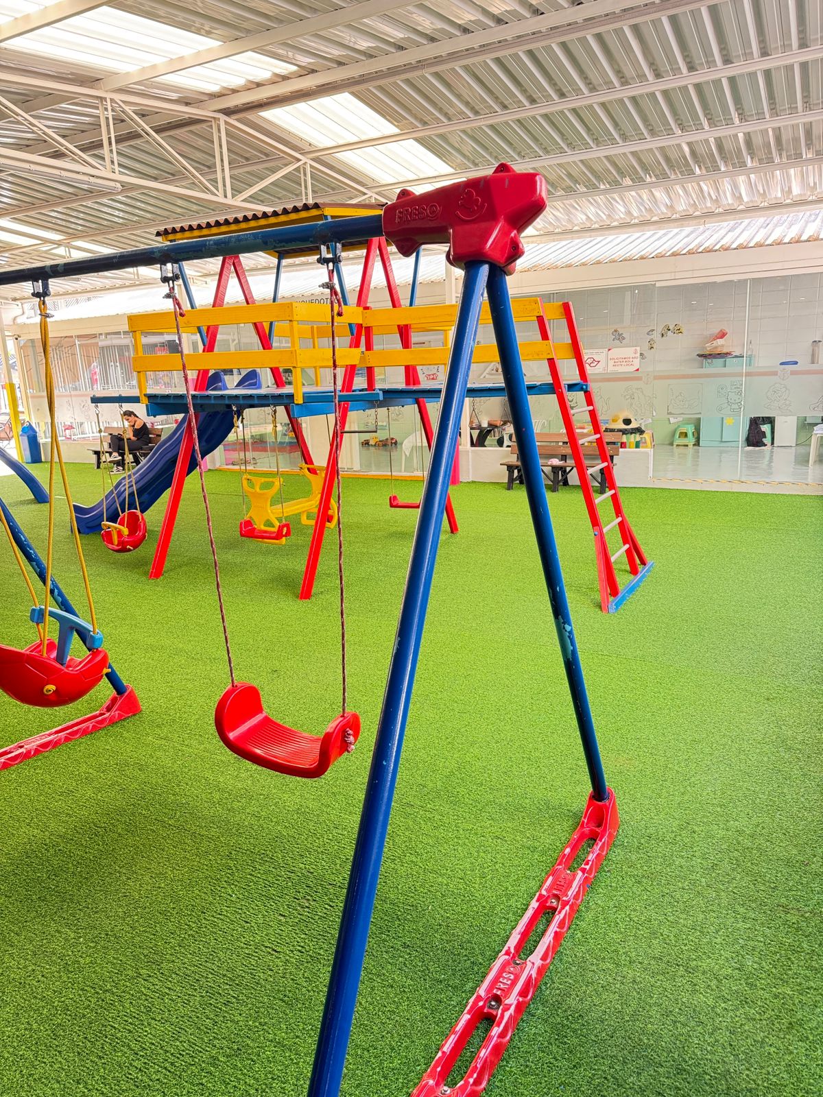 O espaço climatizado, que funciona ao lado do playground, é atraente, com monitora, jogos, lápis e papel sempre atualizados e novos.